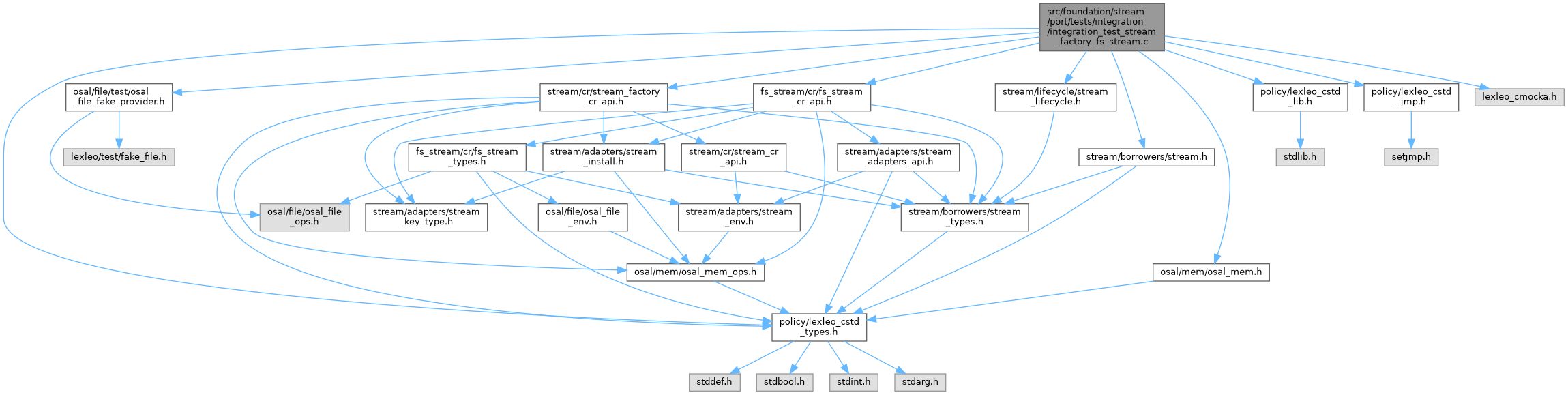 This file implements integration-level validation of the interaction between the stream factory and the fs_stream adapter registered through the Composition Root API.